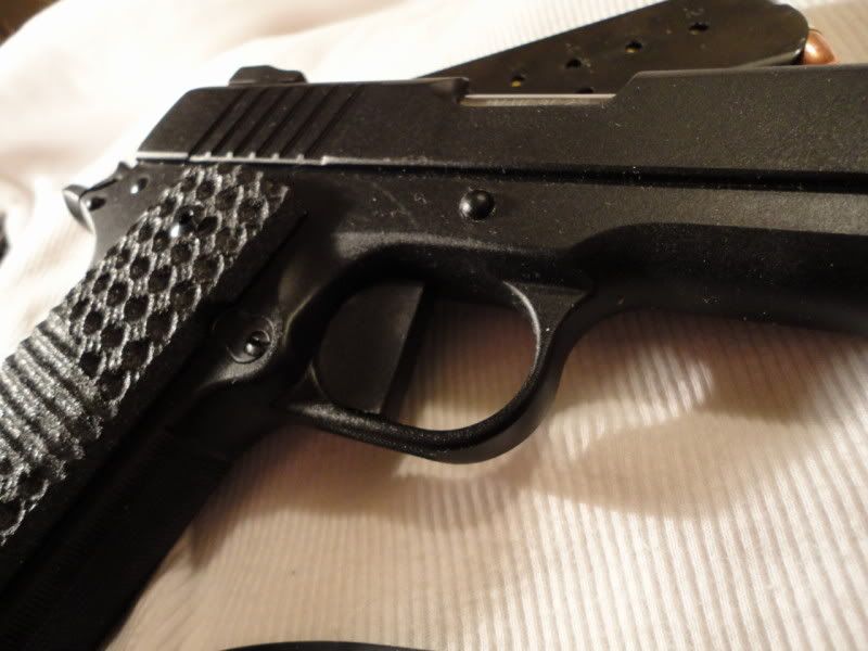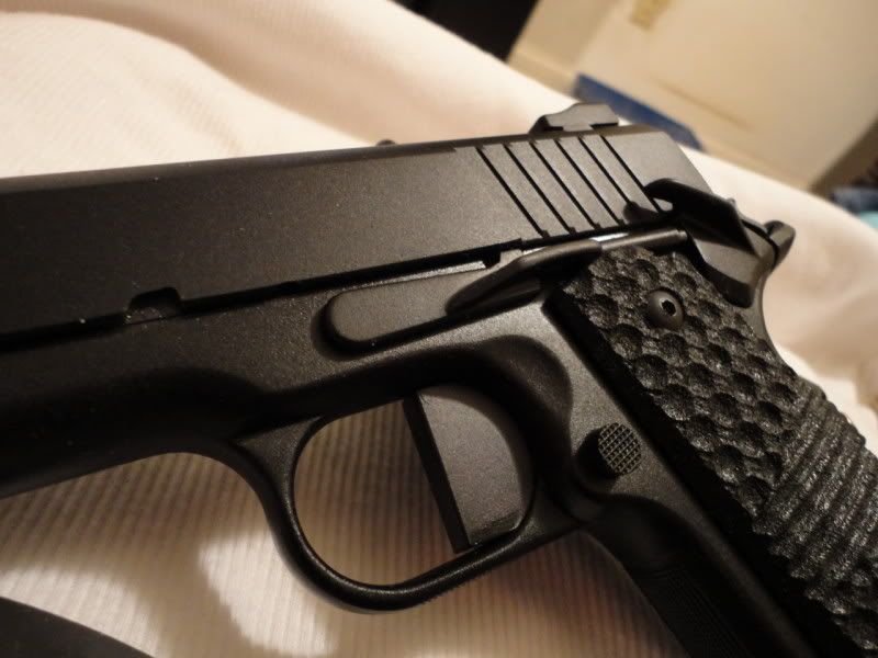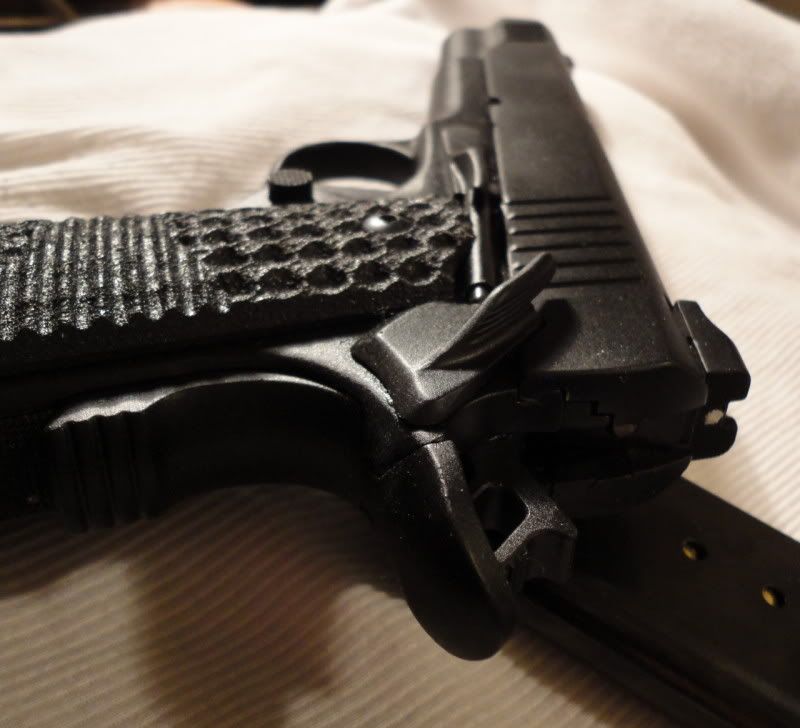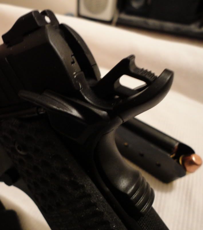 I stripped it to the frame/slide and barrel and replaced everything from the pins and springs up with all high end machined parts that i hand fit myself. I even switched over to a GI style guide rod and plug as i didn't like the plug at the end with a hole in it as it couldn't be beveled. Then as i just mentioned i beveled and melted the gun to my liking and sanded the billboards off the sides.