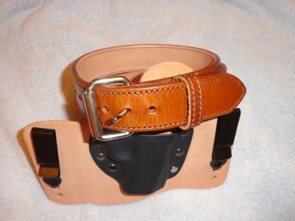 The belt is from A Better Belt USA. It is nearly .25" thick, 2-layer bull hide. This is my very first "real" carry rig. Thanks to all those who offered their advice.