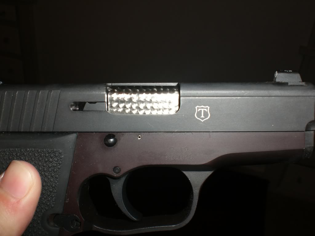A "find" in a local pawnshop, so I picked it up. An early model (ser no. AD20XX) K9 with a black slide and plum-colored frame (think HK P7), standard Hogue rubber grips. Sights were replaced with XS Nightsights (lollipop-style), barrel hood was jewelled, and the muzzle looks like it was crowned and polished. The trigger is the kicker, the length of pull is about 2/3 of my K9 Elite, and the reset is at the same place (no going ALL the way forward to the front of the triggerguard anymore for the reset "click"), and the trigger is probably about 4-1/2 lbs and SMOOOOOTH. TJ's emblem is just forward the ejection port on the right side of the slide.