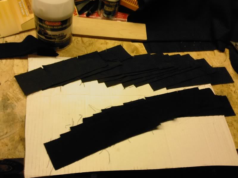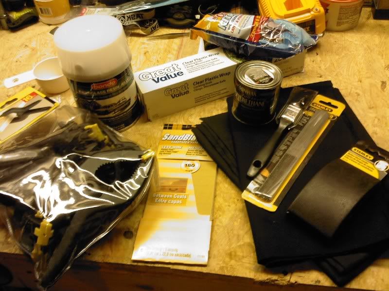 After reading a how-to on making some grips using layers of denim and fiberglass resin I decided to give it a try. I bought my denim from Hobby Lobby and got 2/3 yd in black and 2/3 yd in dark gray. In the light at my house the dark gray looks more like navy, which is also okay with me. I couldn't find any fiberglass resin at HL so I went to AutoZone and picked up some there by Bondo called fiberglass resin "jelly" which turns out isn't what I was looking for. So I ended up having to go back out to ACE and picked up just some fiberglass resin (no jelly, the jelly isn't clear). I had to pick up a few other assorted materials for the project like a file, a sanding block, chainsaw sharpener, latex gloves, saran wrap..thus far I have about $65 in this project. I have plenty of fabric and enough resin to make 5 sets of grips.