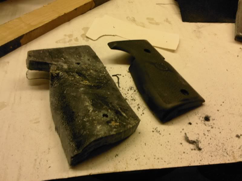 . I started this project to give me something to do until I start work on the 28. I am hoping I can come out with a nice set of grips though. As for the inside of the grips, I went by the factory grips and tried to get it close then just kept putting it to it and see what needed trimmed more until it fit into place. The grip that I have the most work done on is fitted pretty good at the front of the panel, but I haven't grooved the rear of the panel. I was going to wait until I have the other grip caught up and see how hard it is to fit them to each other before I put a groove in it for the rear of the frame.