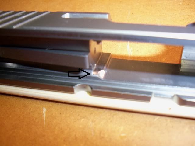 I rounded off the sharp edge and polished this edge and the angled surface. This seems to help my return to battery issue. Originally, it would fail to return to battery about every third round. Now, it returns to battery every time, except for Federal Hydra Shoks, which seem to catch on the feed ramp.
