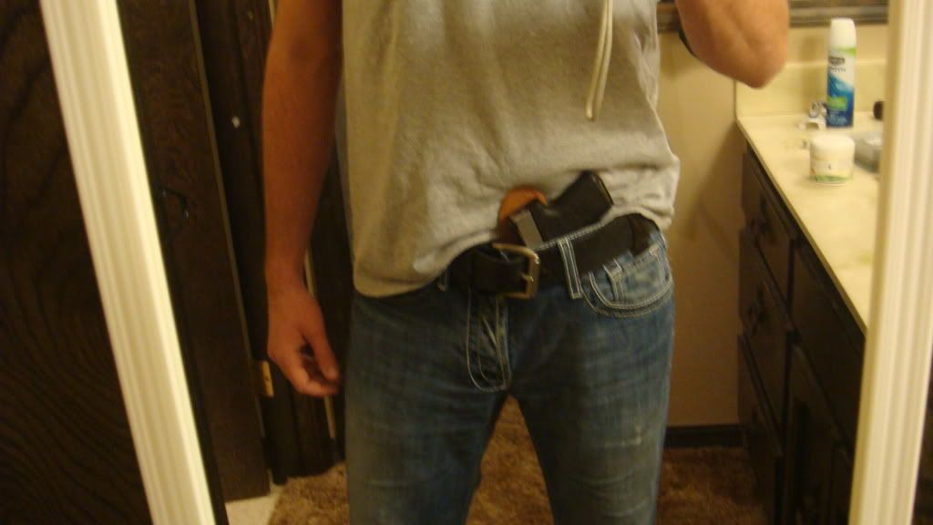 I'm using a position very much the same as your pictures but I end up with a noticeable bulge in the belt line and the end of the barrel prints about where your finger is pointing in the picture of you grasping the gun.Originally posted by HeyGuysWatchThis View PostMy method posted above works great with my Wranglers. Now they have to be sized properly, but it's no problem for me.