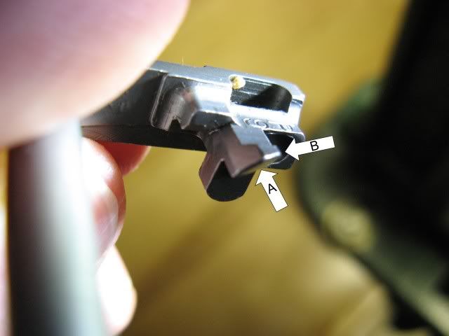 Good pics. Actually the point right above "A" label is the point on the top of my diagram. Note how that point is what is touching your ammunition in the second picture. I don't see any need to remove the point at "B". What I did was eliminate the point above "A". I tried to make a flat line between "B" and the point on the other side of "A".