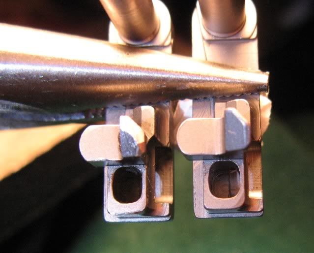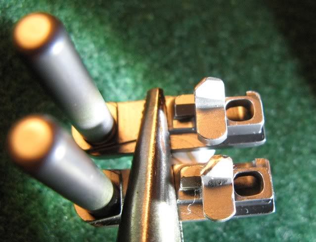 You aren't grinding the upper part of the slide stop, but how far it protrudes inward from the left side of the frame. What I did was hold the slide stop in my hand, oriented the way it would be in the gun and ran the point that contacts the ammunition up and down a file being held vertically. I wanted to file the point in the same direction that the magazine (and ammo travels). On the underside of this point is the "landing" for the metal pin in the magazines to push against when the mag is empty, so you have to be careful not to file too much of that landing away as well.