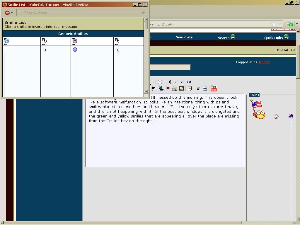Well, I'm using 18.0.1 and it is still messed up this morning. This doesn't look like a software malfunction. It looks like an intentional thing with Bs and smilies placed in menu bars and headers. IE is the only other explorer I have, and this is not happening with it. In the post edit window, it is elongated and the green and yellow smilies that are appearing all over the place are missing from the Smilies box on the right. The Smilies popup window is all screwed up and I cannot find those 2 smilies in there, either. Here is a screen print.