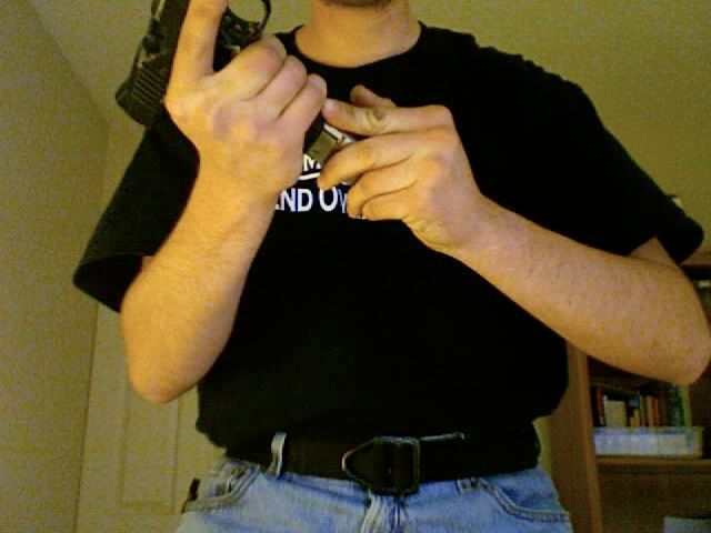Slow down right HERE and look at your gun to make sure that you've got the mag going into the gun - then keep running it. Notice how my index finger is on the frontstrap of the frame, which allows me to guide the single stack mag into the hole that's barely larger than the mag.