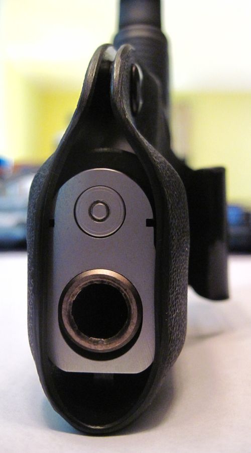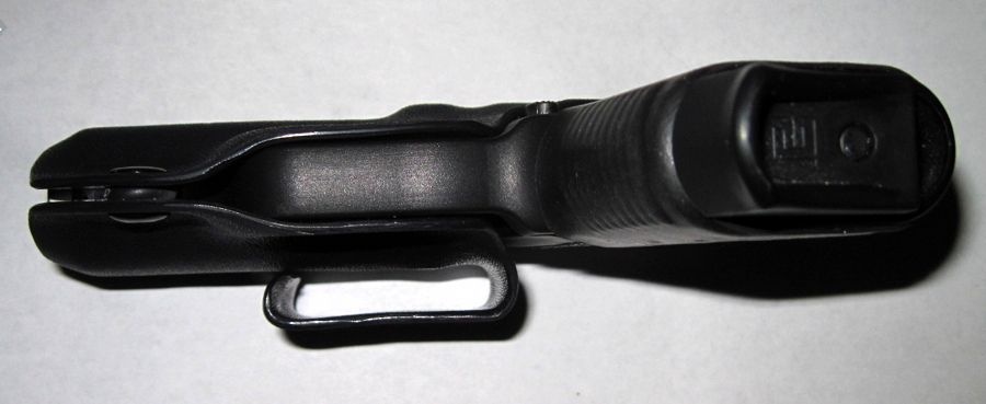 The kydex is molded snugly to the outlines of the CM9, but rounds them off, so that, for example, the slide lock lever doesn’t dig into the wearer. Also on this side of the holster, the kydex extends all the way to the rear of the slide, which acts as a barrier between the gun and the wearer, eliminating any chafing from the slide and presumably acting as barrier against sweat.