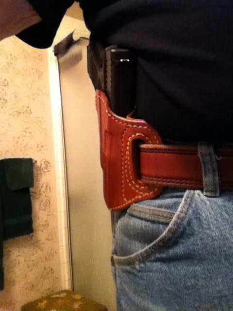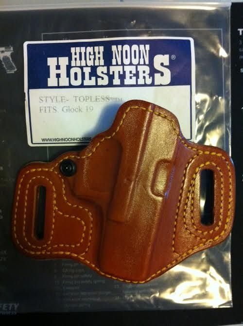 I just received this High Noon Pancake holster today ( http://www.highnoonholsters.com/cate...duty-holsters/ ). I ordered it only a week ago, but I paid extra to get it made and shipped quickly (normal lead time is 6-8 weeks). The holster was expensive, but worth every penny IMHO. The holster is beautifully made and fit my gun perfectly right out of the box. It is lined, and I ordered this one without the slide guard, as I never wear my gun directly next to the skin, so I don't need the slide-guard. I bought this holster based on another High Noon holster I had purchased for my SigPro 2022 (http://www.kahrtalk.com/showthread.p...The-Difference ). The Sig is a large gun and I wanted a OWB holster that would conceal it well. My Glock 19 is not quite as large as the Sig, but is a challenge to conceal well non-the-less. The High Noon Extreme Duty holsters are without question the best I have found for concealing a larger gun. Notice how high the gun rides relative to the belt, and how tight to the body it rides. When worn under a regular polo or button shirt, there is virtually no printing because of the high,tight ride and the aggressive forward cant. I am not exaggerating when I say that with this holster my Glock conceals as well as my Shield, which is a much smaller gun. I am extremely happy with this purchase!