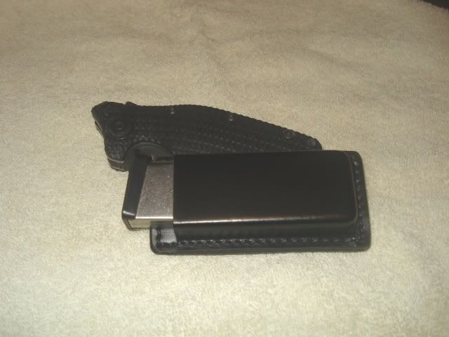 I want to start carrying an extra mag on my waist instead of just tossing it in whatever pocket is empty... I'm looking for a pouch small a possible, to stow one K9 7round mag, with a belt clip that can either go ItW or OtW and made form black soft material, leather preferably, no Kydex.